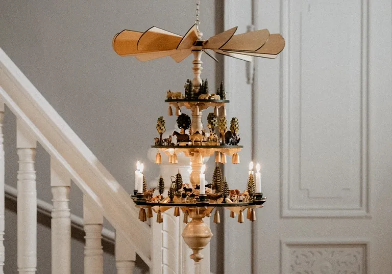 Unser Seiffener Stifter Christian Werner persönlich hat uns vor kurzem diese prachtvolle Pyramide aus seiner Manufaktur im Treppenhaus unseres Stiftungshauses in Dresden-Blasewitz angebracht. Motiv des Pyramidenleuchters ist das Paradies, mit zahlreichen Tieren, Bäumen und Figuren, die die Tradition der Seiffener Volkskunst widerspiegeln.
